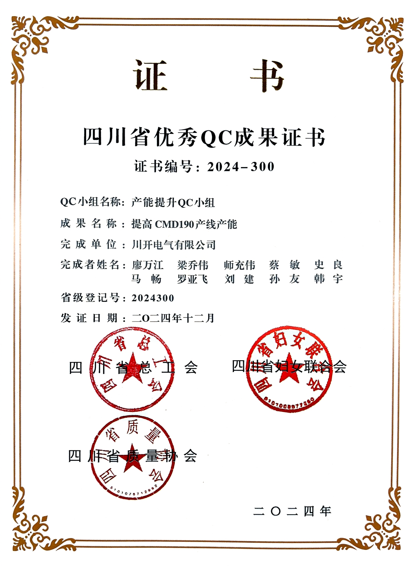 近日,特銳德川開電氣榮獲多個(gè)四川省優(yōu)秀QC成果。公司分別圍繞“提升CMD190、KYN28、TGS產(chǎn)線產(chǎn)能20%”及“提升二次線接線正確率,降低二次線工費(fèi)率”兩個(gè)課題成立QC小組,堅(jiān)持以問題為導(dǎo)向,協(xié)同攻關(guān)、精準(zhǔn)克難,力求為客戶提供精致產(chǎn)品與優(yōu)質(zhì)服務(wù)。